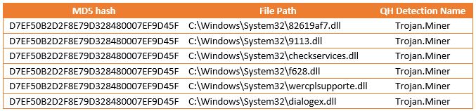 The batch script modified the existing ‘wercplsupport’ service to use the miner DLL instead of the legitimate one. The DLL name “wercplsupporte.dll” was used to masquerade as the legitimate DLL name, which is “wercplsupport.dll”. Later this masqueraded ‘wercplsupport’ service was configured as autostart.