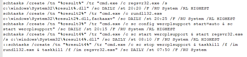 Created multiple scheduled tasks with random names. Each task was to execute the commands shown below.