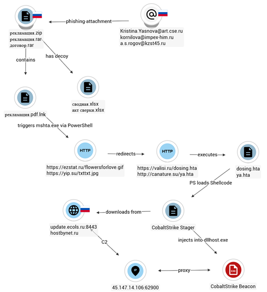 Seqrite Labs has identified a targeted malware campaign, tracked as Operation FrostBeacon, which is delivering Cobalt Strike beacons to companies within the Russian Federation. The phishing emails indicat that the threat group is financially motivated which targets organization responsible for payments, contracts, reconciliation, legal risk. More than 20 initial infection files have been observed where the intrusion relies on a multi-layered infection chain with two different clusters; one infects through phishing archive files that contain malicious shortcut files. The second cluster leverages the legacy CVE-2017-0199 template injection vulnerability and even chains it with another old Equation Editor vulnerability CVE-2017-11882.