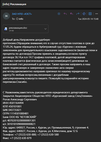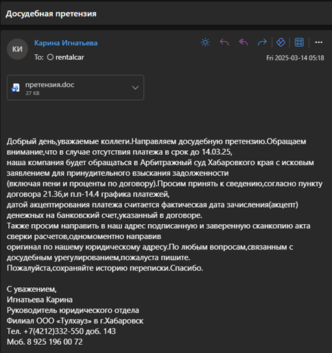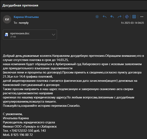 The phishing email in this case claims to be a legal demand for debt repayment. It states that if payment is not received before 14.03.25, they will file a claim in the Khabarovsk Arbitration Court to recover overdue funds, including penalties and interest. The message cites specific terms of a supposed contract and requests a signed and certified reconciliation statement, original document to be mailed to their legal address and to maintain the email correspondence trail.