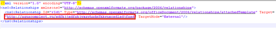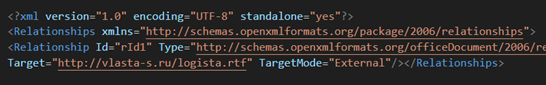 More such emails have been observed which clearly indicate a mass phishing template, manually or automatically reused. Inside the malicious document attachement рекламация.docx, the word/settings.xml.rels file contained an attachedTemplate relationship referencing an external template hosted at aquacomplect[.]ru as shown below: