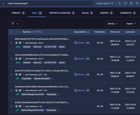 We hunted for more such initial infection files based on the Russian filename of the archive file “рекламация” as this did not have any phishing email. This led us to 5 files in total and a couple of more infection chains along with some interesting emails.