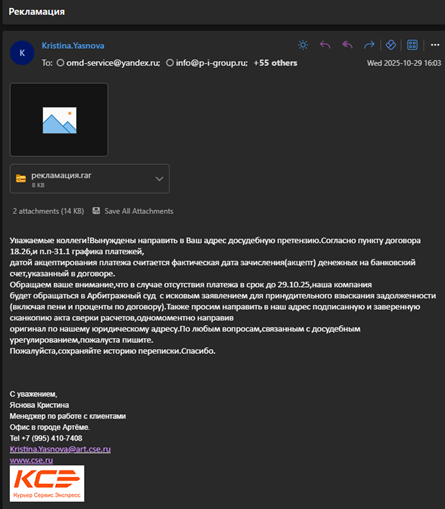 In one infection chain, a phishing email has been identified which is sent from the email ID: “Kristina.Yasnova@art[.]cse[.]ru” as seen in the below image. The RAR archive contains a decoy and a shortcut file in a similar fashion.