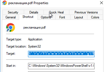 The LNK file is camouflaged to resemble a PDF document through double extension format. The filename “рекламация” means claim/complaint, again fitting business-oriented email lures. When the user double-clicks the file, it triggers the following command via cmd.exe: