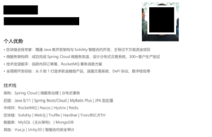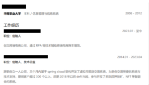 Basically, The PDF is a Chinese-language résumé, which contain experience as senior backend / blockchain full-stack engineer (Java + Solidity) with experience building high-throughput trading systems and DeFi/smart-contract projects. It lists a bachelor’s degree from 华南农业大学 – South China Agricultural University (2008–2012), work history in 惠州 and 深圳 (Guangdong province) including founder/tech-lead roles, and many crypto/DeFi and high-concurrency trading system projects. The CV emphasizes Spring Cloud microservices, RocketMQ, MySQL, Solidity/Hardhat, and production experience for trading exchanges and DeFi protocols (TVL and customer counts are claimed).