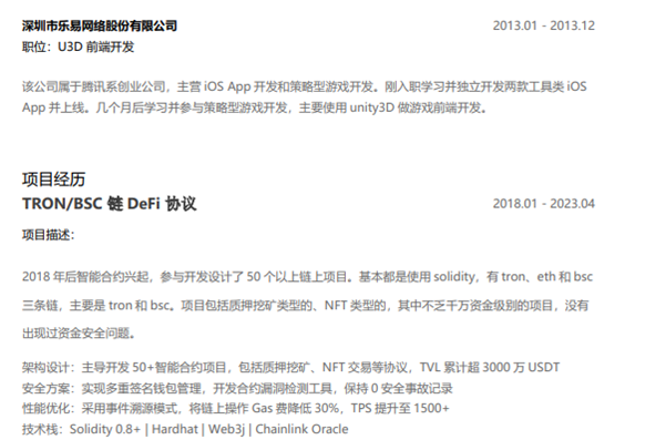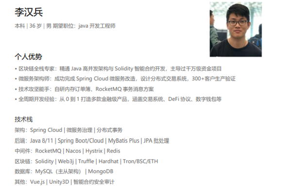 Basically, The PDF is a Chinese-language résumé for 李汉兵 (Li Hanbing), a senior backend / blockchain full-stack engineer (Java + Solidity) with experience building high-throughput trading systems and DeFi/smart-contract projects. It lists a bachelor’s degree from 华南农业大学 – South China Agricultural University (2008–2012), work history in 惠州 and 深圳 (Guangdong province) including founder/tech-lead roles, and many crypto/DeFi and high-concurrency trading system projects. The CV emphasizes Spring Cloud microservices, RocketMQ, MySQL, Solidity/Hardhat, and production experience for trading exchanges and DeFi protocols (TVL and customer counts are claimed).