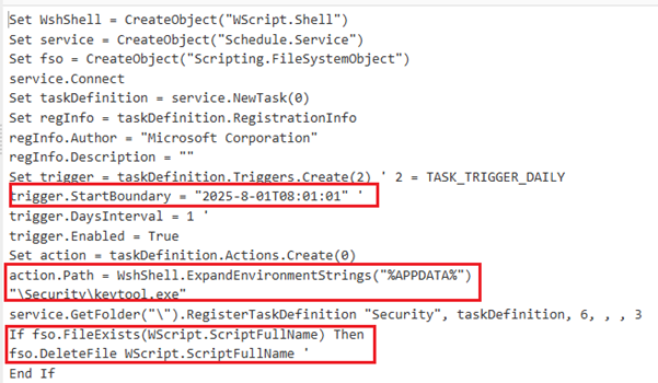 The VBScript instantiates COM objects (WScript.Shell, Schedule.Service, Scripting.FileSystemObject), connects to the Task Scheduler, and programmatically creates a daily scheduled task named “Security” (trigger type = daily, StartBoundary = 2025-08-01T08:01:01, DaysInterval = 1) whose action executes %APPDATA%\Security\keytool.exe (constructed via ExpandEnvironmentStrings); it also sets the task registration metadata to Author = “Microsoft Corporation” (likely spoofing a benign author) and, after registering the task in the root folder, deletes the VBScript file itself to reduce forensic traces—effectively providing persistent, scheduled execution of the dropped payload.