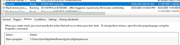 Additionally, the malware deploys a scheduled task via the CreateHiddenTask.vbs script. This task is designed to execute keytool.exe every day at 8:00 AM, ensuring persistence and regular execution of the malicious payload.