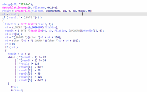 Upon analysing the loader Jli.dll we found that this loader quietly opens its own executable (keytool.exe), reads a specific region derived from the PE headers, and scans that region for a distinct 8-byte marker sequence: 1C 3B 7E FF 1C 3B 7E FF. Once it finds the marker, everything after it is copied into a buffer and treated as an encrypted payload. The function then constructs a 256-byte S-box and runs the standard RC4 routine: a KSA (key scheduling) seeded with the ASCII key “123cba”, followed by the PRGA (keystream generation) which XORs the keystream with the copied bytes to produce the decrypted payload.