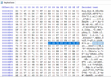 Inside Keytool.exe there is an encrypted shellcode payload — i.e. the malicious code is hidden and scrambled so that static analysis won’t detect it immediately.