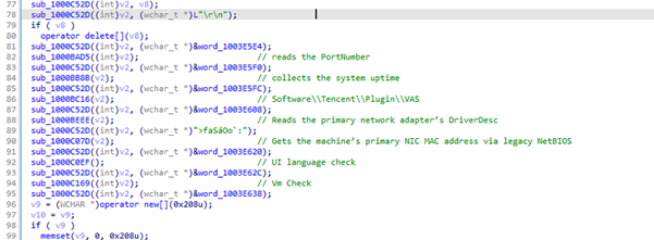 sub_1000BC16 | Enumerates HKCU\\Software\\Tencent\\Plugin\\VAS subkeys (6–11 chars) or scans user folder for numeric directory names; appends space-separated results + \\r\\n. | Fingerprints QQ/Tencent accounts or numeric IDs; detect enumeration of that Tencent key or folder scans for numeric dir names. | ||