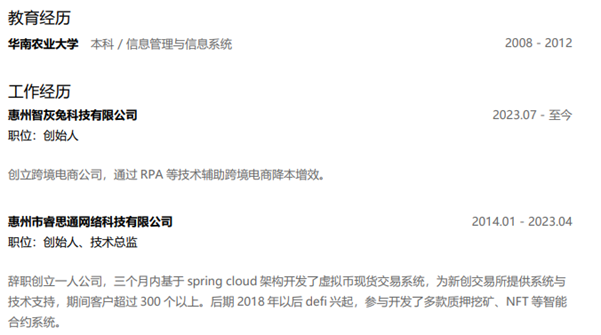 - Work locations / companies: the CV mentions 惠州 (Huizhou) and 深圳 (Shenzhen) — both cities in Guangdong province, PRC. Company names like “惠州智灰兔科技有限公司 (Huizhou Zhihuitu Technology Co., Ltd.)” and “惠州市睿思通网络科技有限公司 (Huizhou Ruisitong Network Technology Co., Ltd.)” point to Chinese companies.