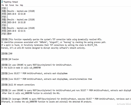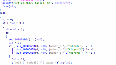 It identifies processes associated with “360Safe”, “kingsoft”, or “Huorong” by checking the owning process path.