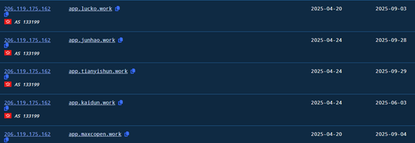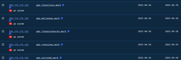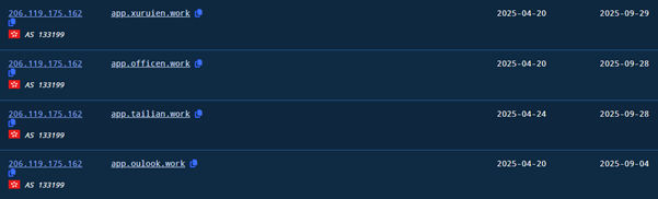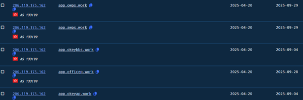 In addition to the pan.tenire.com domain used to deliver the résumé decoy and malicious payloads, we identified a broader infrastructure cluster on 206.119.175.162 (AS133199, SonderCloud Limited, Hong Kong). At more then 20+ sibling domains (app.jinanjinyu.work, app.maitangou.work, app.jiangsuzhaochu.work, app.rongxingu.work, app.xinrendu.work, app.owps.work, app.awps.work) were observed pointing to the same IP. The consistent naming convention (app.*.work) and use of the .work TLD strongly suggest these were intended to impersonate job portals or work applications, fitting neatly with the résumé-themed lure. This indicates a deliberate effort to build a thematic, resilient infrastructure set supporting Operation Silk Lure.