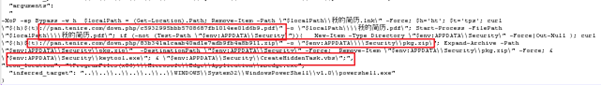 During initial static analysis of the downloaded shortcut 李汉彬.lnk, we observed more than 260-character sequences consistent with a PowerShell command-line payload. The command appears to reference a target file path (see snapshot), suggesting the LNK acts as a dropper/execution vector for a subsequent PowerShell-based stage.