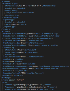 XML files are Windows scheduled task definitions that runs daily starting at 2025-09-25T01:41:00-08:00 and has a logon trigger for the user specified. These tasks are hidden and configured to run even when the computer is idle, on demand, and without network. They ignore multiple instances and have no execution time limit.