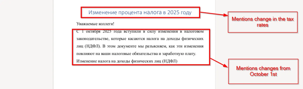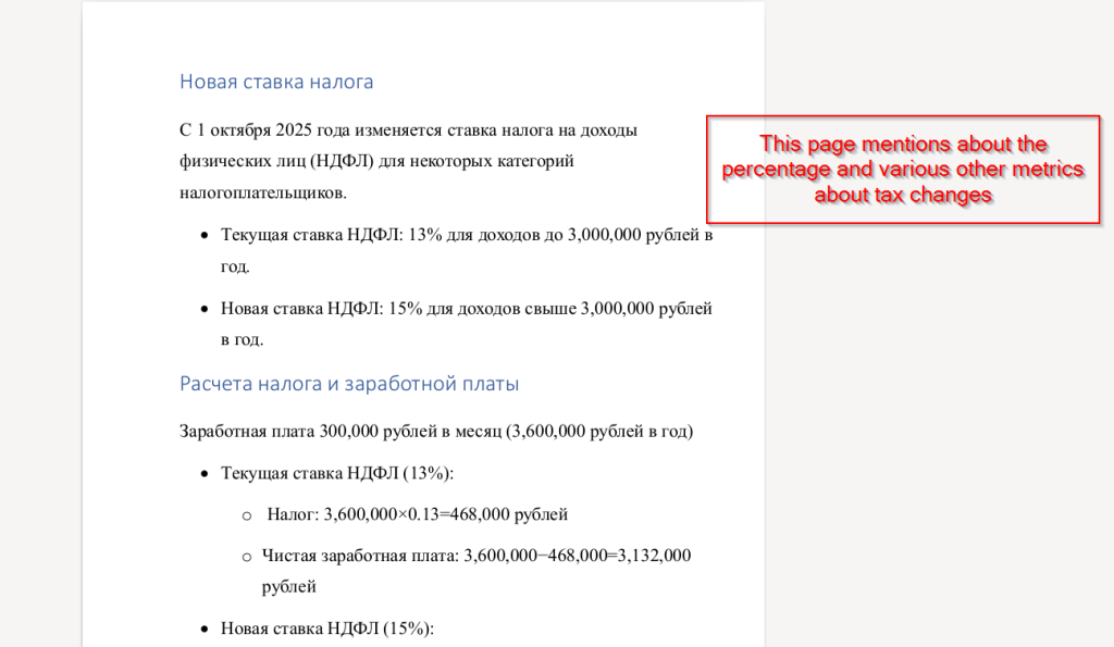 Next, looking at the second page, we found that it contains calculations related to the percentage of personal income tax (PIT), illustrating how the new tax rate affects employees’ annual income. The document compares the previous 13% rate with the new 15% rate for incomes exceeding 3,000,000 rubles, showing the resulting changes in total tax and net salary.