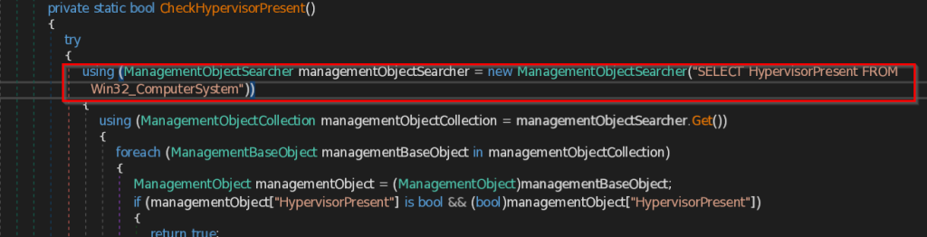 - CheckHypervisorPresent – This function uses query SELECT HypervisorPresent FROM Win32_ComputerSystem to check the presence of Hypervisor, which is a software to manage multiple virtual machines in a system.