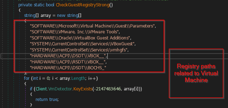 - CheckGuestRegistryStrong – This function checks for the registry key paths specifically related to virtual machine present in the system. The function contains list of most likely known registry paths belongs to the virtual machine and compare them with the system paths.
