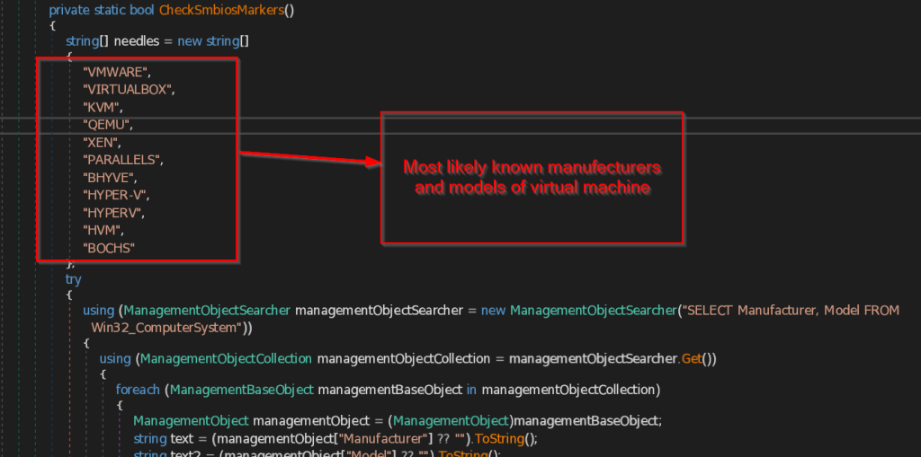 - CheckSmbiosMarkers – This function checks for the System Management BIOS , that contains the list of Virtual machines manufacturers and models present in the system .Then it compares the retrieved data with common list of virtual machines that this function contains.