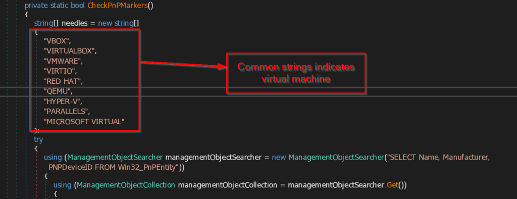 - CheckPnPMarkers – This function collects all the PNP (Plug and Play) Devices and their name , manufacturer and PNPDeviceID which is unique for each device present in the system. Then it compares the data with most common strings that may be available to detect the presence of virtual machine.