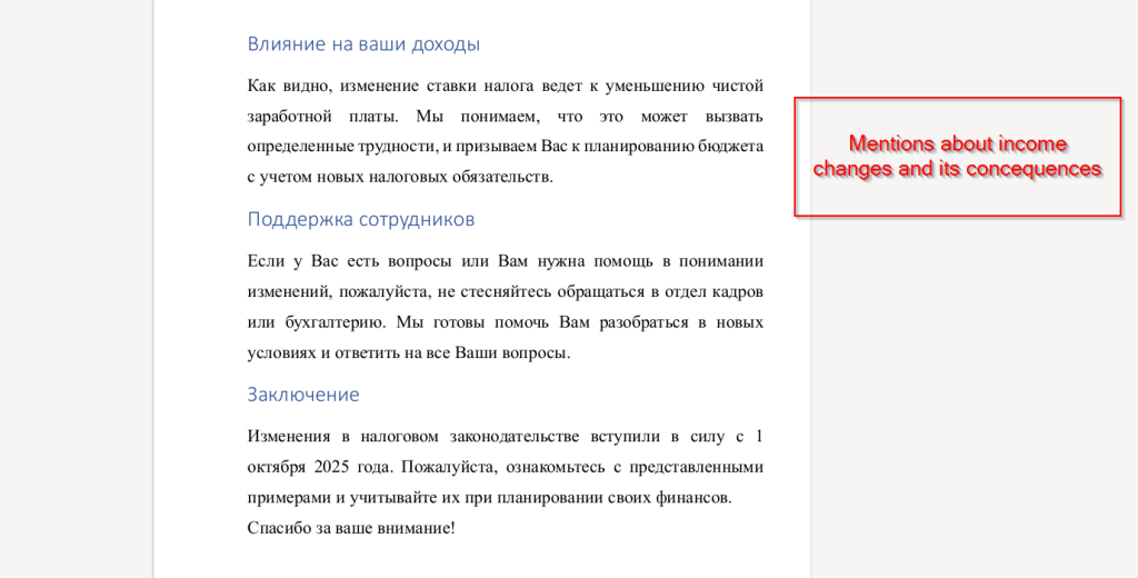 Well, the final and last page mentions income-related changes, explaining how the new personal income tax rate leads to a decrease in net salary. It also provides guidance for employees, encouraging them to plan their budgets according to the updated tax obligations and to contact the HR or accounting department if they need any clarification or assistance regarding the new rules.