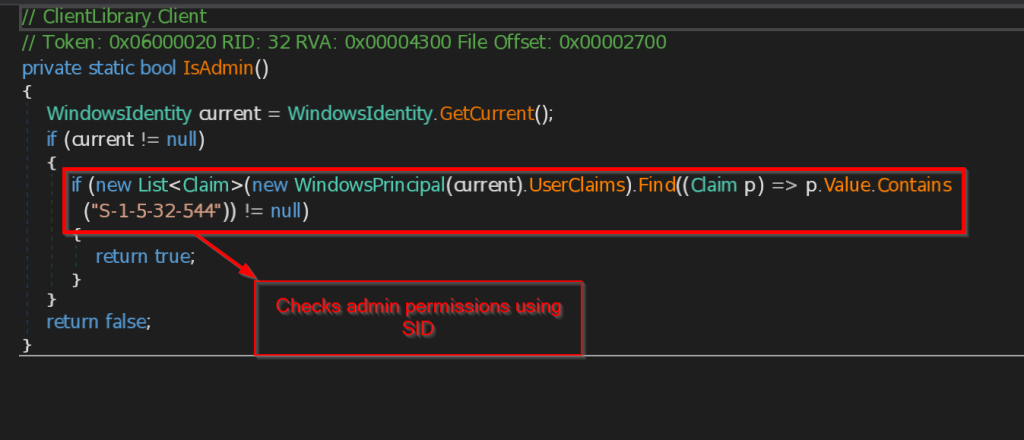 - IsAdmin – This function checks whether the binary has some certain administrator level privileges using something known as Security Identifier , it does it by checking the current security identifier against the Administrator’s Security Identifier.