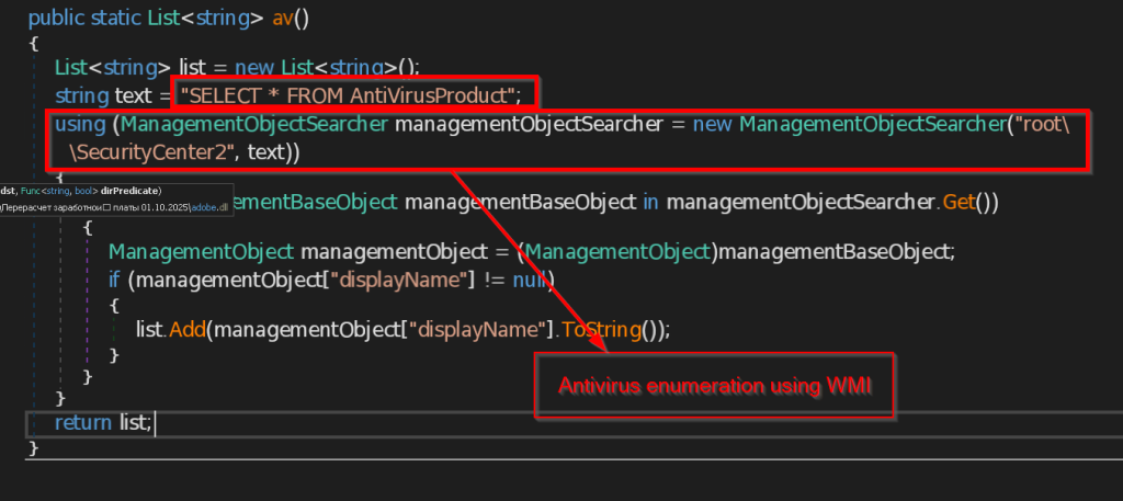 - av – This function checks for all the installed Antivirus software in the current user account using the query SELECT * FROM AntiVirusProduct using WMI and returns the list to the C2 Server.