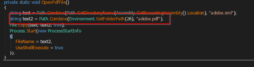- OpenPdfFile – This function opens the decoy document on the user screen as pdf