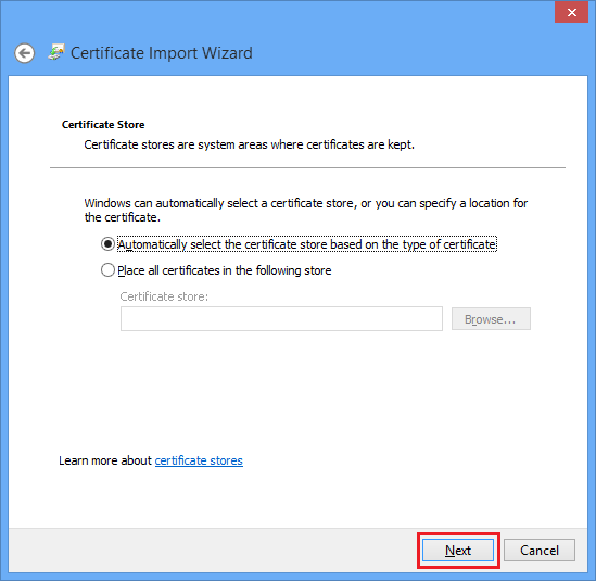 5. Select the Automatically select the certificate store based on the type of certificate Click Next.\